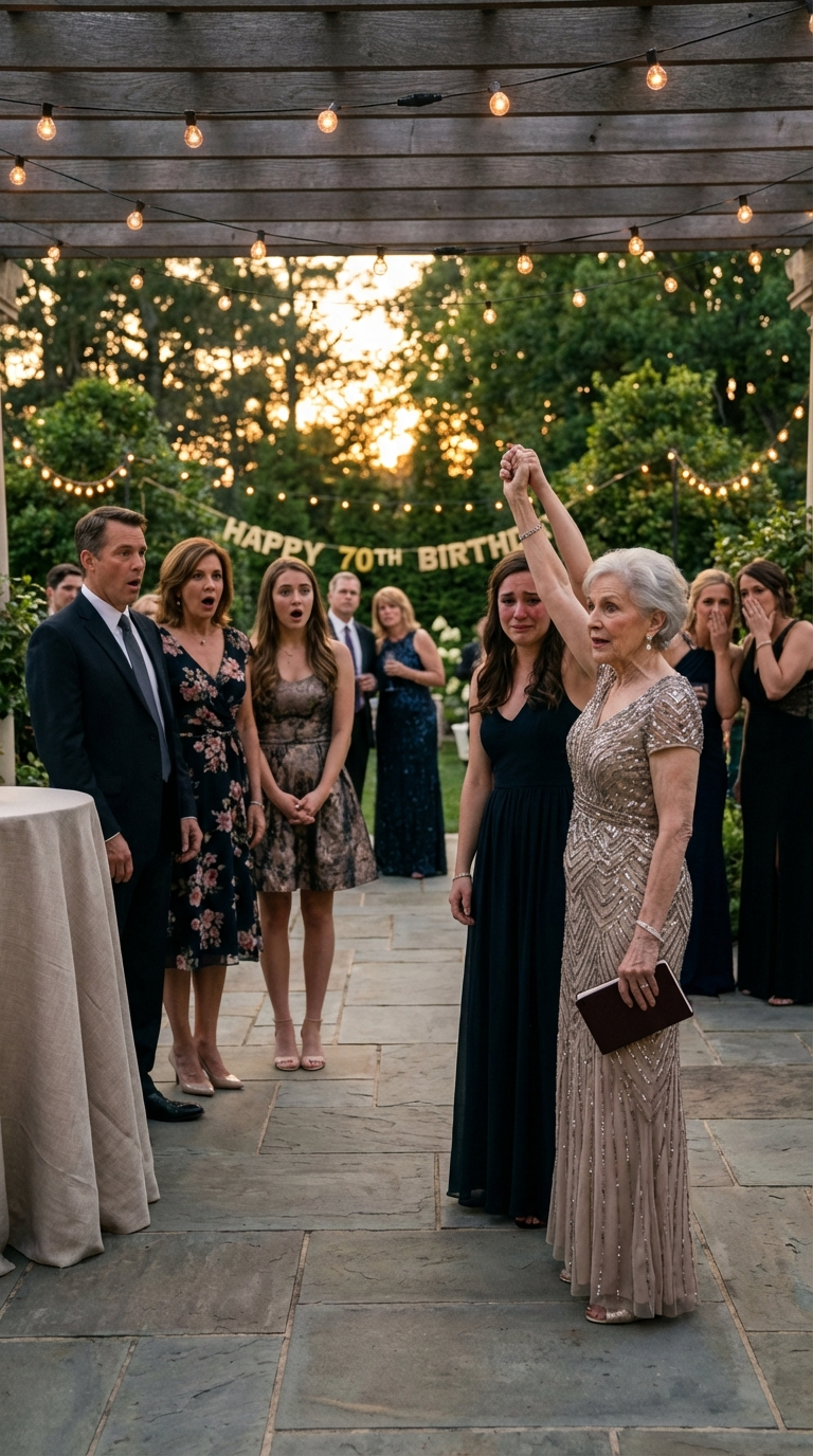 “Everyone, please stay a moment longer,” Grandma said. Her voice was surprisingly strong, amplified by the speakers. “It is my seventieth birthday. An old woman is allowed to clarify a few things.”