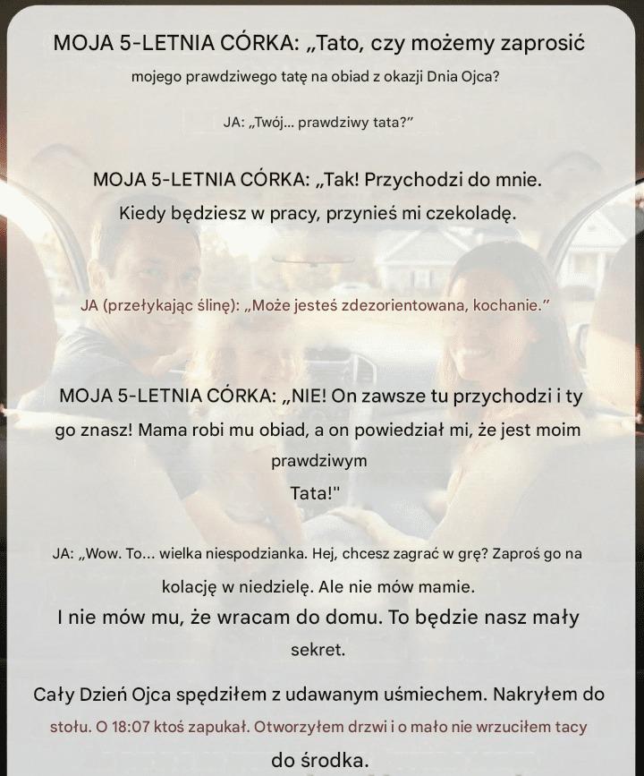 Nic w głosie Lily nie brzmi dramatycznie ani napominająco. Zadaje się to pytanie tak, jak prosi się o dodatkową pomoc w domu czy o cokolwiek innego. Wpadka pojawiła się w pokoju jako zwykły fakt z jej życia, coś, co zmyśliła, coś, co już wiedziałam. To mnie najbardziej zaniepokoiło. Jej niewinność jest lustrem, odbiciem przepaści między światem, w którym żyła, a tym, który myślałam, że dzielimy. Kiedy urządziła „niespodziankę z okazji Dnia Ojca”, poczułam, jak coś we mnie drży, jakby drży. Kieruje tym delikatnie, zadając jedno ostrożne pytanie za drugim, starając się nie zdradzić, jak szybko bije mi serce.