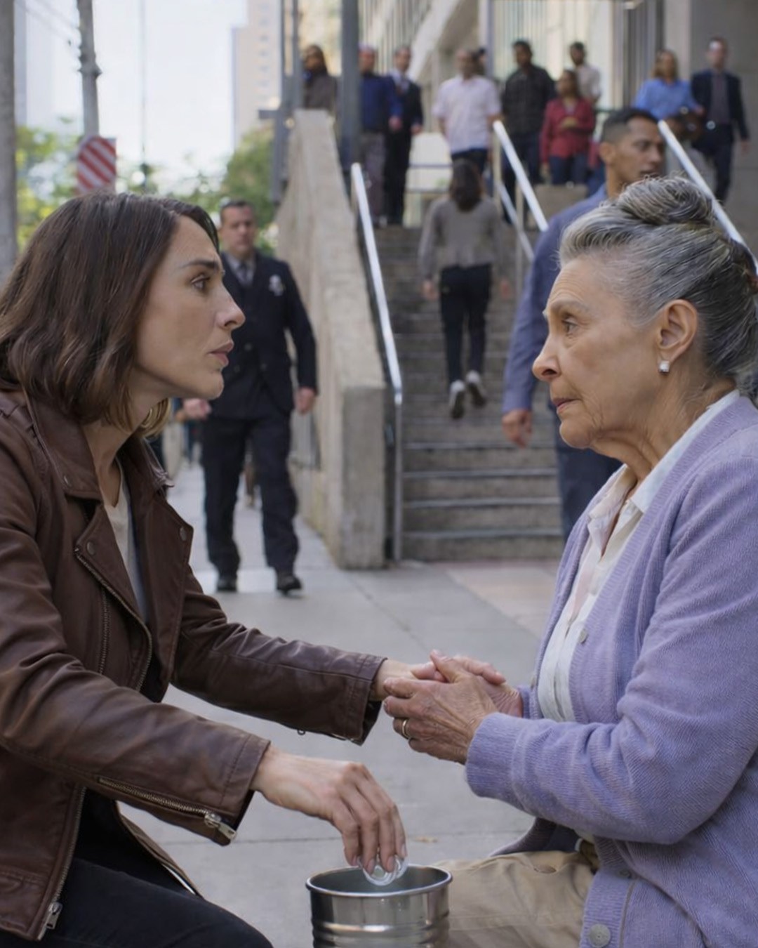 Tam, tuż przy drzwiach, siedziała starsza kobieta na zmiętym kawałku tektury. Simone zauważyła ją już pierwszego dnia nowej pracy. Staruszka nigdy głośno nie błagała, nie jęczała i nie wyciągała ręki. Po prostu siedziała tam, otulona w wyblakły płaszcz, z małym blaszanym kubkiem przed sobą. Na tekturowej tabliczce, krzywo napisanym napisem, widniał napis: „Proszę o pomoc”.