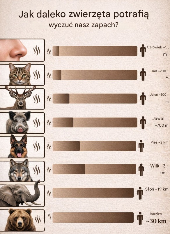 Zwierzęta posiadają niezwykle czuły węch. To, co dla człowieka jest ledwie wyczuwalnym aromatem, dla nich stanowi wyraźny sygnał ostrzegawczy. Jeleń może wyczuć zapach człowieka nawet z odległości do 500 metrów, jeśli wiatr wieje w jego stronę. Dzik potrafi wykryć go jeszcze dalej.